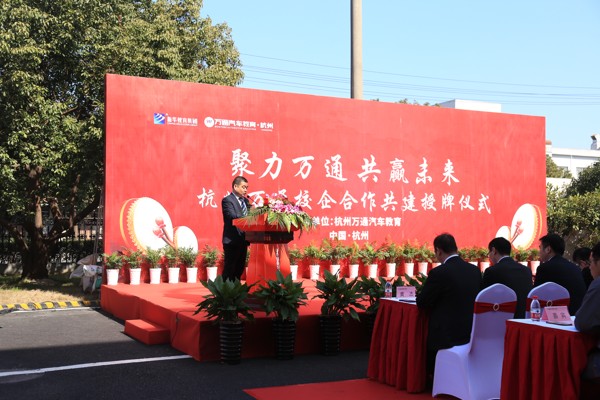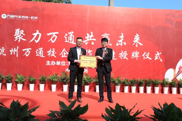 欢迎辞后,校企签约授牌仪式正式开始,杭州万通分别为浙江胖妞新能源汽车有限公司、杭州临平小拇指、杭州余杭广德汽车装潢有限公司、上汽通用别克湖州安吉九通汽车销售服务有限公司等6家名企授予了“实训基地”牌匾,标志着杭州万通与各大名企在汽修人才的培养方面迈出了实质性的一步,形成了更加健全的“校企双向课堂”的教学机制。